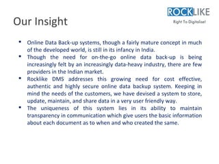 The document outlines Rocklike DMS's vision of providing secure online data backup solutions tailored for the Indian market, which is still developing in this area. It highlights the founding team's qualifications, market potential, and the company's strategy for reaching clients, particularly SMEs in major cities. Additionally, it identifies key financial needs and potential threats, while detailing planned milestones and exit strategies for the business.