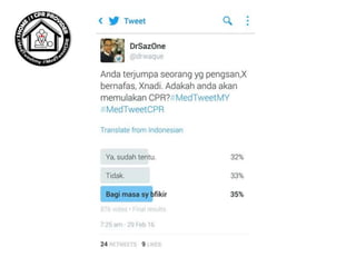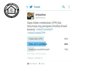 Dokumen ini membincangkan cabaran dalam 'chain of survival' dengan fokus kepada kurangnya pengetahuan dan kecenderungan untuk melakukan CPR. Ia menyarankan latihan perlu diberikan kepada orang ramai dan menerangkan teknik CPR serta keperluan untuk memeriksa nadi dan keadaan mangsa secara berkala. Kemudian, ia menekankan bahawa hands-only CPR dapat meningkatkan peluang hidup mangsa yang mengalami jantung berhenti di luar hospital.