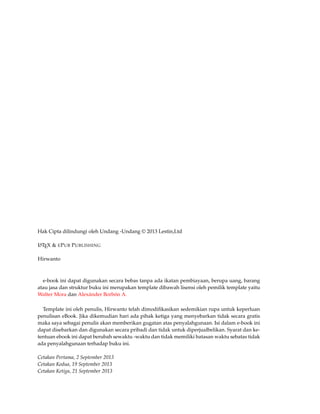 E-book ini merupakan panduan gratis mengenai penggunaan LaTeX, termasuk instalasi, pengaturan dokumen, dan penerapan berbagai fitur dalam typesetting. Hak cipta e-book dilindungi oleh undang-undang dan tidak boleh diperjualbelikan. Kontennya dapat digunakan secara pribadi dengan syarat tidak ada penyalahgunaan terhadap e-book ini.