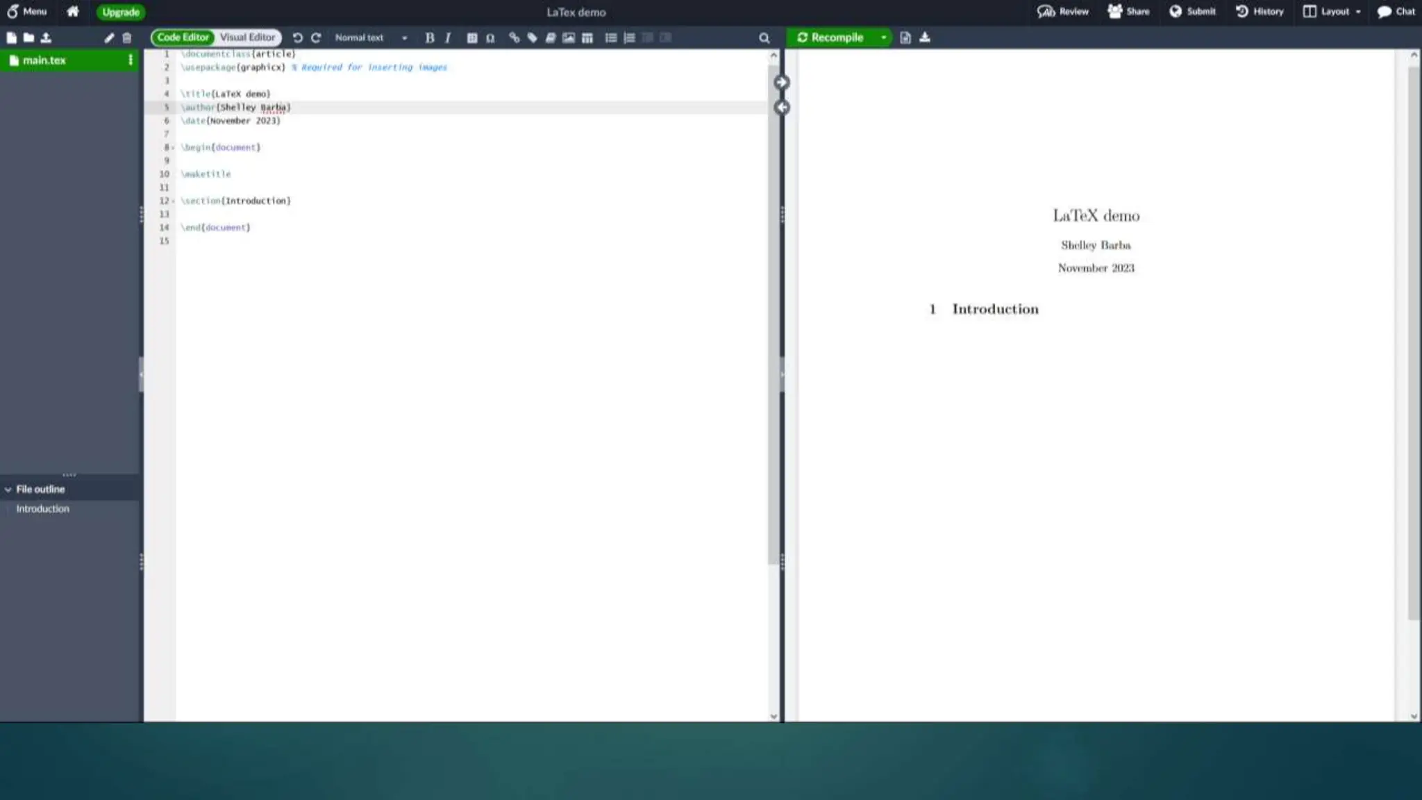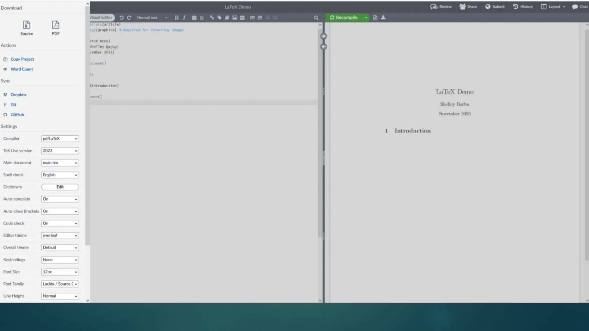 The document provides guidance for graduate students on setting up and using LaTeX through the Overleaf editor, including account registration and file management. It covers essential commands, packages, and formatting techniques for creating documents that include text, equations, tables, and citations. Notable hotkeys for efficiency in editing and compiling are also outlined.