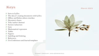 The document provides an introduction to LaTeX, covering topics such as document structure, sections and subsections, lists, mathematical expressions, tables, figures, labeling, references, and using journal templates. It also discusses LaTeX editors and compares LaTeX to Microsoft Word. Various LaTeX commands are demonstrated and explained.