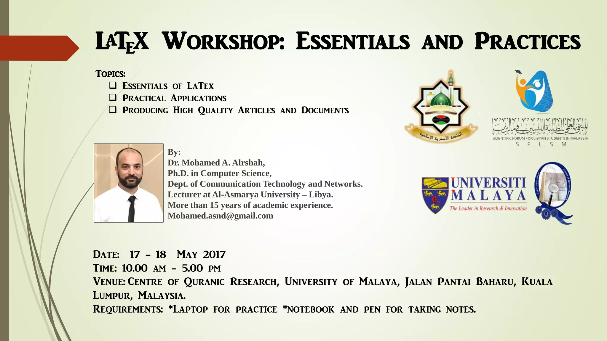 The document announces a LaTeX workshop to be held on May 17-18, 2017 in Kuala Lumpur, Malaysia, covering LaTeX essentials, practical applications, and producing high quality articles and documents, and is presented by Dr. Mohamed A. Alrshah who has over 15 years of academic experience.