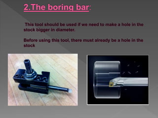 Lathe is a machine that helps shape materials into desired forms by performing operations like turning, cutting, sanding, knurling and drilling. Common lathe operations include facing, turning, grooving and parting. Facing removes metal from the end of a workpiece to create a flat surface. Chamfering bevels the edge of a workpiece, such as after thread cutting. Knurling imprints a diamond pattern onto a surface for better grip. Parting cuts a groove through a workpiece to shorten it.