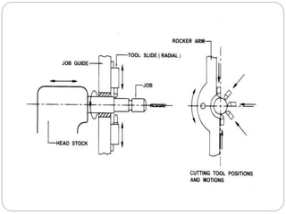 The document discusses lathe machines. It defines a lathe as a machine that removes metal from a workpiece to shape it. It then describes some key parts of a lathe like the bed, headstock, tailstock, and carriage. It explains the working principle of a lathe where the cutting tool is fed into a rotating workpiece to shape it. Finally, it summarizes some common lathe operations like turning, facing, drilling and threading.