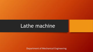 This document describes a lathe machine used in mechanical engineering. It discusses the history and purpose of lathes, common operations like facing, tapering, and parallel turning. Safety precautions are outlined. Dimensions and specifications provided for a mini wood lathe include a 3ft base, 180W motor, and RPM calculation. The objectives are to use local materials, reduce costs, encourage indigenous technology, and increase productivity.