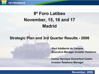 This document contains a presentation by Petrobras executives discussing the company's strategic plan and 3rd quarter results for 2006. The presentation outlines Petrobras' key drivers and business strategies, including expanding natural gas and downstream operations. It provides macroeconomic assumptions for 2007-2011 and details Petrobras' $87 billion investment plan over that period focused on exploration and production, downstream activities, and international expansion. Production targets, main projects, and financial targets are also summarized.