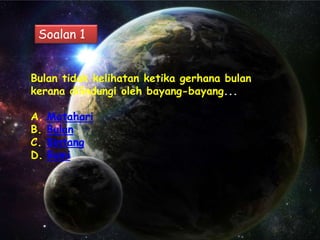 Dokumen tersebut menyenaraikan 5 soalan berkaitan fenomena gerhana matahari dan bulan. Soalan-soalan tersebut meliputi penjelasan tentang apa yang berlaku semasa gerhana, susunan benda langit yang menyebabkan gerhana, dan pernyataan yang benar mengenai gerhana matahari.
