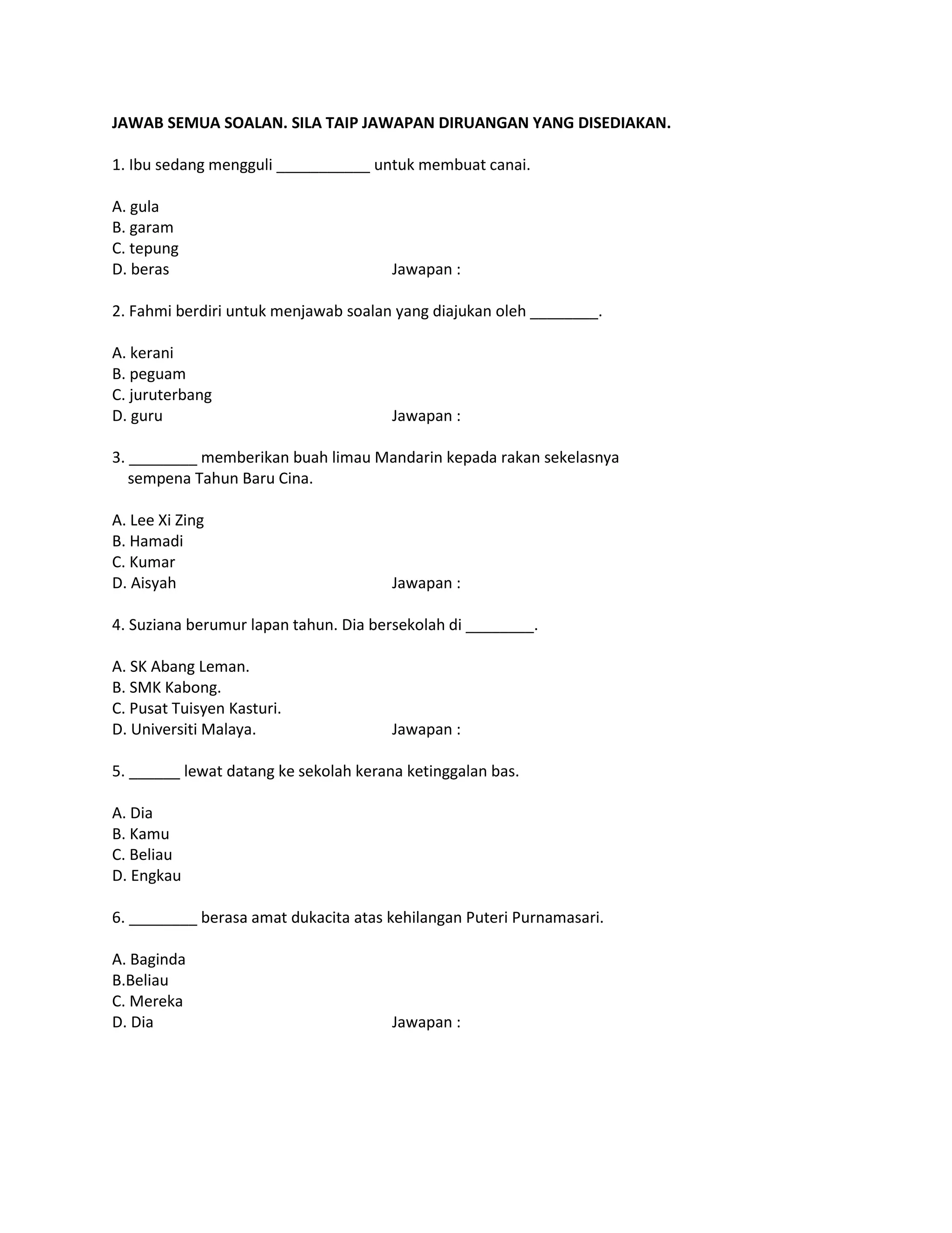Dokumen ini mengandungi soalan-soalan pelbagai pilihan yang memerlukan jawapan tentang situasi harian dan peribadi. Ia termasuk soalan mengenai aktiviti memasak, tanggungjawab, dan interaksi sosial. Terdapat juga soalan mengenai sekolah dan perasaan individu.