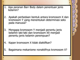 Dokumen tersebut berisi 10 pertanyaan tentang determinasi jenis kelamin pada mamalia. Pertanyaan-pertanyaan tersebut mencakup peranan Barr Body, perbedaan antara kromosom X dan Y, penentuan jenis kelamin laki-laki dan perempuan, aktivasi dan nonaktivasi kromosom X, sindrom Klinefelter, SRY, dampak 3 kromosom X pada wanita, kompensasi dosis kromosom, dan mutasi pada kromosom X seorang laki-laki dan