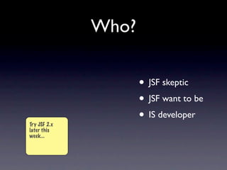 The document discusses JavaServer Faces (JSF) 2.0 as part of the Java EE 6 standard, highlighting its features such as a component-based architecture, improved support for AJAX, and better integration with contemporary web technologies. It contrasts JSF with other frameworks, addressing advantages like simplified configurations and managed beans. The document also includes links to resources and tutorials for further exploration of JSF 2.0.