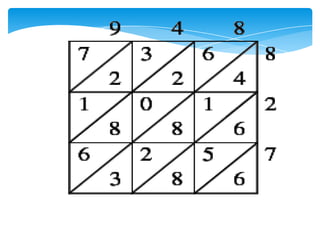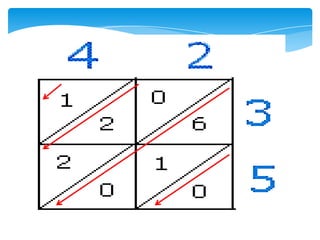 Dokumen ini membahas tentang kaedah pendaraban menggunakan metode lattice dan rod Napier. Metode ini dijelaskan dengan langkah-langkah mendarab dua bilangan dan cara menghitung hasilnya. Selain itu, dokumen juga membagikan contoh penerapan untuk kedua metode tersebut.