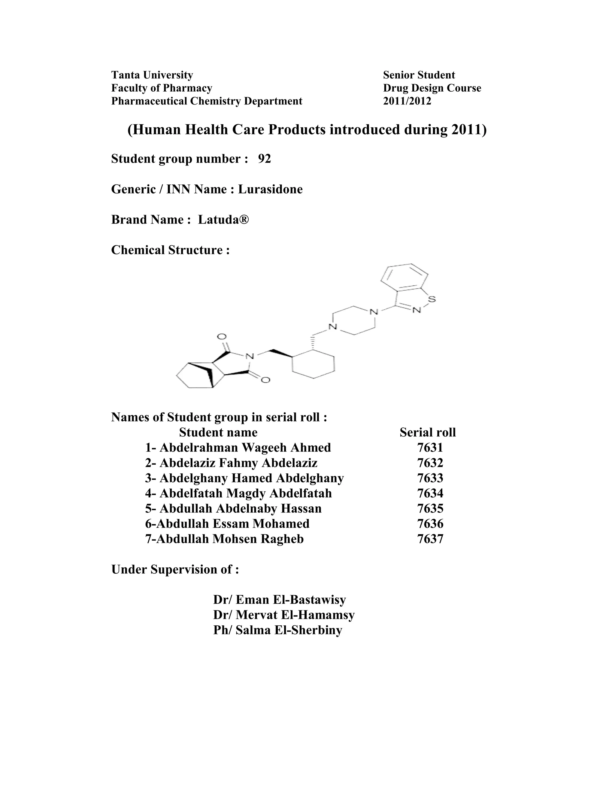 This document details the drug Lurasidone, branded as Latuda®, an atypical antipsychotic approved for treating schizophrenia in adults. The document outlines its chemical structure, mode of action, dosages, indications, and potential side effects, emphasizing its unique receptor-binding profile and lack of certain negative side effects typical of other antipsychotics. It also discusses the drug's advantages and disadvantages compared to existing medications and notes its expected rise in market sales as a leading atypical antipsychotic.