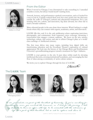LAUDE is a new publication focused on advancing intellectual discourse in Chicago through engaging interviews, photography, and commentary from respected voices. It aims to connect educated Chicagoans interested in the arts, science, technology, culture and society. The first issue features topics like how digital shifts are transforming education and Northwestern University's progress on diabetes treatment. LAUDE seeks to elevate ideas, cross boundaries, and encourage the free flow of thought among active culture seekers in the city.