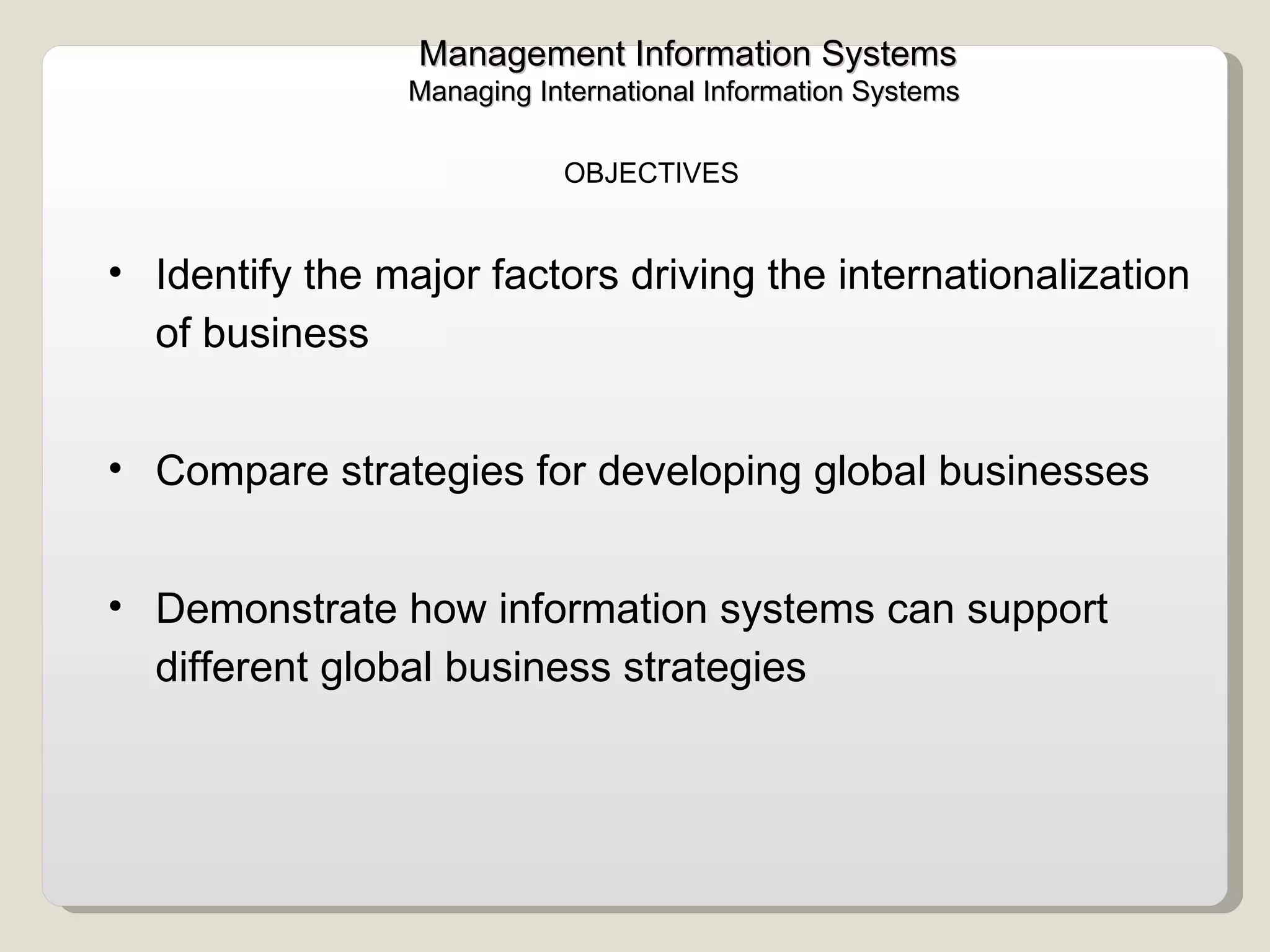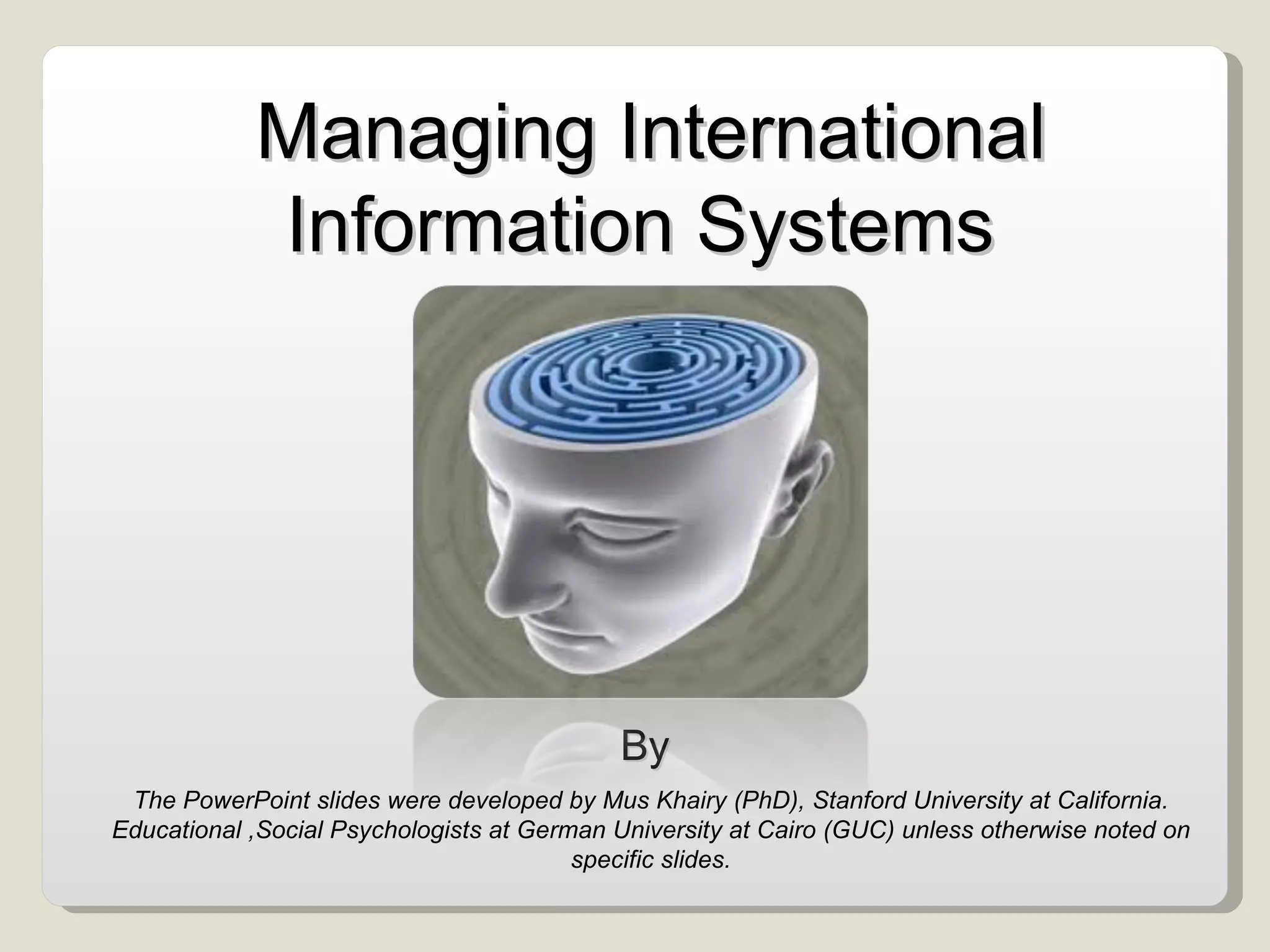 This document discusses managing international information systems. It identifies key opportunities and challenges, such as lowering costs through global scale economies or difficulties managing change across cultures. It recommends solutions like agreeing on common requirements, coordinating applications development, and encouraging local support for global systems. The growth of international business drivers and how information systems can support different global strategies are also examined.