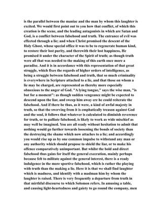 The document discusses the relationship between laughter and madness, as articulated in Ecclesiastes 2:2, suggesting that worldly laughter may diminish the reverence for truth, equating it with madness. It emphasizes the dangers of wit that plays with truth, particularly when it pertains to sacred topics, as this type of humor can lead to moral injury and a lack of respect for religious beliefs. Ultimately, the document calls for caution in speech, recognizing the profound impact that words can have on society and individual souls.