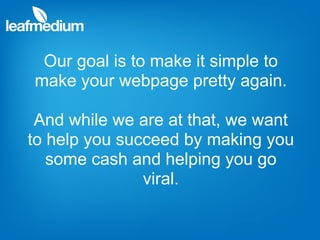 Our goal is to make it simple to create attractive and functional webpages. We have focused on simplicity while also adding many features to help users succeed commercially and go viral. Though simple to use, Leaf Medium Pages is powerful and includes collaboration tools, auto-scaling servers, metrics, and more affordable technologies from major companies. We designed it based on user feedback to meet people's needs and support our employees.