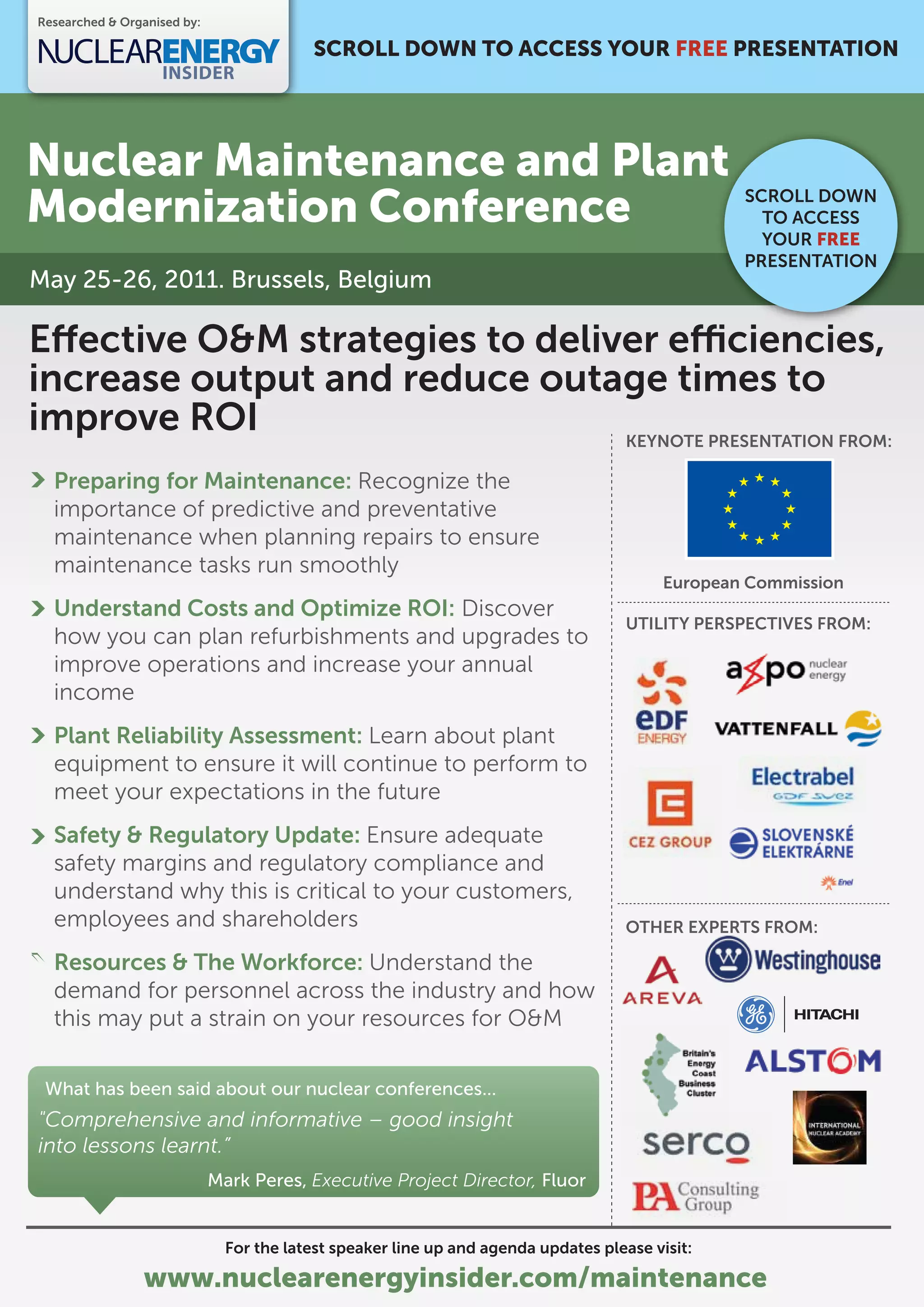 This document advertises and provides information about the Nuclear Maintenance and Plant Modernization Conference happening on May 25-26, 2011 in Brussels, Belgium. The conference will focus on effective operations and maintenance strategies to improve efficiency, increase output, and reduce outage times. Speakers will discuss topics like predictive maintenance, understanding costs and return on investment, plant reliability assessments, safety and regulatory issues, and managing resources and workforces. The document provides an agenda, speaker information, pricing details, and encourages attendees to register before certain dates to receive discounts.