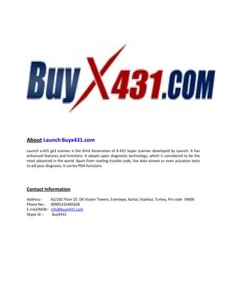 Launch Buyx431.com sells the Launch x-431 gx3 scanner, the third generation automotive diagnostic tool developed by Launch. It has enhanced features, uses open diagnostic technology considered the most advanced, and can read trouble codes, live data streams, and perform actuation tests to aid diagnosis. The company is located in Istanbul, Turkey and can be contacted by phone, email, MSN, or Skype for purchase and support.