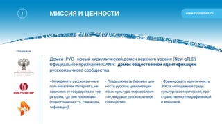 Домен .РУС — это домен верхнего уровня, который записывается символами русского языка. Домен .РУС призван объединить мировое русскоязычное интернет-сообщество и оказать поддержку в распространении и популяризации русского языка и культуры в Сети.