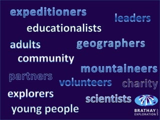 Brathay Exploration Group aims to (1) introduce themselves and their recent successes and future plans, (2) network, and (3) showcase their expeditions in the UK and abroad. They are based at Brathay Hall estate and organize scientific expeditions, Duke of Edinburgh awards, leader training, and accommodation. Members can get involved through expeditions, leadership, or organizational roles by speaking with leaders overseeing specific programs.