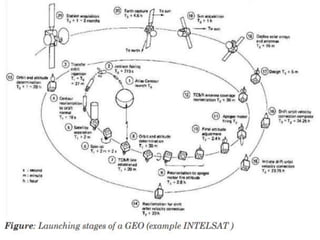 Launch vehicles use multi-stage configurations and rocket propulsion to inject payloads into specific orbital trajectories based on velocity and altitude, with chemical propulsion being the most common but ion engines providing higher exhaust velocities. Satellites are launched on expendable or reusable vehicles depending on their design from sites around the world, with factors like Earth's rotation sometimes providing an assist through sling effect to reduce launch costs. Over 2500 satellites currently orbit Earth for purposes including communication, and careful orbital placement prevents collisions despite increasing congestion.
