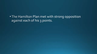 This document discusses key aspects of Alexander Hamilton's plan to establish the national bank and financial system of the early United States. It describes Hamilton's proposals to have the federal government assume states' Revolutionary War debts, create the first Bank of the United States, and impose taxes on imports. It also discusses disagreements between Hamilton and Madison over state debts and between Hamilton and Jefferson over the constitutionality of the national bank.