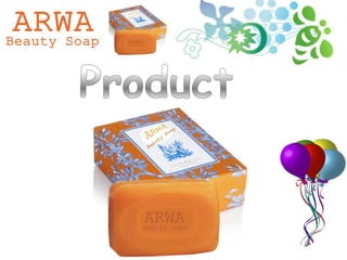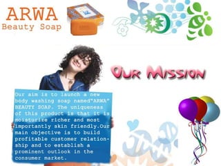 This document presents information about a proposed beauty soap product called "ARWA". It discusses the product details such as the brand name, packaging, ingredients, and benefits. The target market is identified as people aged 16-24 who are students and 28-35 who are working professionals from upper and middle class families. The soap contains aloe vera and has a jasmine scent. Market segmentation and positioning focus on the skin-friendly and medicinal properties with no side effects. Competitors in the beauty soap market are also acknowledged.