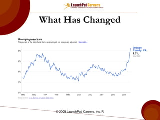 The document provides information about career training workshops offered by Orange County One Stop. The training schedule includes sessions on career mapping, resume writing, interview skills, personal branding, and job search strategies. It also discusses concepts like developing a personal brand and using a candidate-centric model to help job seekers.