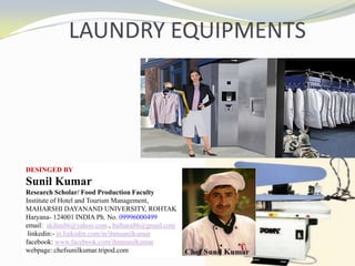 This document discusses commercial and in-house hotel laundries. It defines laundry as a place for washing and finishing clothes and linens. Commercial laundries cater to hotels on a contract basis, while in-house laundries are situated on the hotel's premises to provide quality service. The document describes various equipment used in hotel laundries, including washing machines, hydro-extractors, cuff and collar presses, steam cabinets, folding machines, and carts/trolleys for transporting linens.