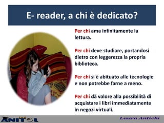 Il documento descrive gli e-reader, dispositivi dedicati agli amanti della lettura e allo studio, che utilizzano tecnologie di visualizzazione come il display e-ink per replicare l'esperienza della lettura su carta. Viene discusso il confronto tra e-reader, tablet e smartphone, evidenziando vantaggi e svantaggi di ciascuna tecnologia, come la durata della batteria e la qualità del display. Inoltre, il futuro degli e-reader è messo in discussione alla luce delle innovazioni nei dispositivi mobili.