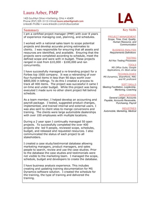 The candidate has over 8 years of experience as a certified project manager with skills in project management, business analysis, testing, technologies, and soft skills. They have experience managing projects in various industries ranging from $10,000 to $800,000 on time and under budget. The candidate holds a Bachelor's degree in Management and certifications in project management.