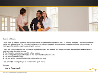 Laura Forcinelli, a real estate agent with Century 21 AllPoints Realty, is proposing her services to sell a potential client's home. She provides an overview of her experience and credentials, as well as details on Century 21's national network, marketing programs, and track record of success. The proposal aims to demonstrate how Forcinelli and Century 21 are well-positioned to market and sell the client's home smoothly and achieve the best price.