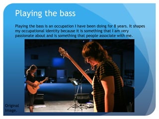 Laura Squires discusses several past, present, and future occupations that shape her occupational identity and enable her to do, be, become, and belong. Some of the key occupations she mentions are playing bass for 8 years, going to church all her life, baking, Pilates, running recently, working for 3 years, presently studying occupational therapy, her future goal of becoming an occupational therapist, spending time with family, and socializing with friends. These various occupations provide her with a sense of identity, passion, fitness, skills, and a sense of belonging within social circles.