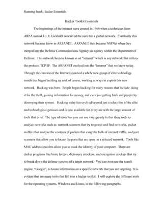 The document discusses various tools used in a hacker's toolkit. It describes network scanners like NetStumbler and Kismet that can detect wireless access points, their security settings, and connected devices. The document analyzes these scanners' abilities and limitations. It also mentions the importance of packet sniffers for analyzing network traffic in promiscuous mode and their uses for intrusion detection, information gathering, and monitoring network usage. The author provides examples of using these tools to probe their neighborhood wireless networks, finding an unsecured network they were able to access to control the router.