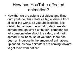 Recent developments in technology have significantly impacted the animation industry. YouTube has provided animators a global platform to share their work, increasing exposure and the overall number of animations created. Additionally, cheaper equipment and free/paid software have lowered barriers to entry, allowing more amateur animators to create and share animations. These developments have given animators new tools to improve their craft, such as onion-skinning to help draw frames, computers for digital editing and animation, and digital photography for easier production and review of work. Overall, modern technology has transformed animation by democratizing creation and distribution while providing powerful new creative tools.