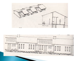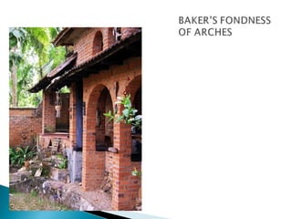 The document provides biographical information about British architect Laurie Baker (1917-2007). It discusses that he went to India in 1945 and lived/worked there for over 50 years, obtaining Indian citizenship in 1989. Some of his accomplishments include designing low-cost housing and medical facilities that incorporated local materials and techniques. He is renowned for promoting simplicity and cost-conscious construction. The document outlines several of Baker's architectural principles and design features, and provides examples of his works including homes, a computer center, and housing for tribal communities.