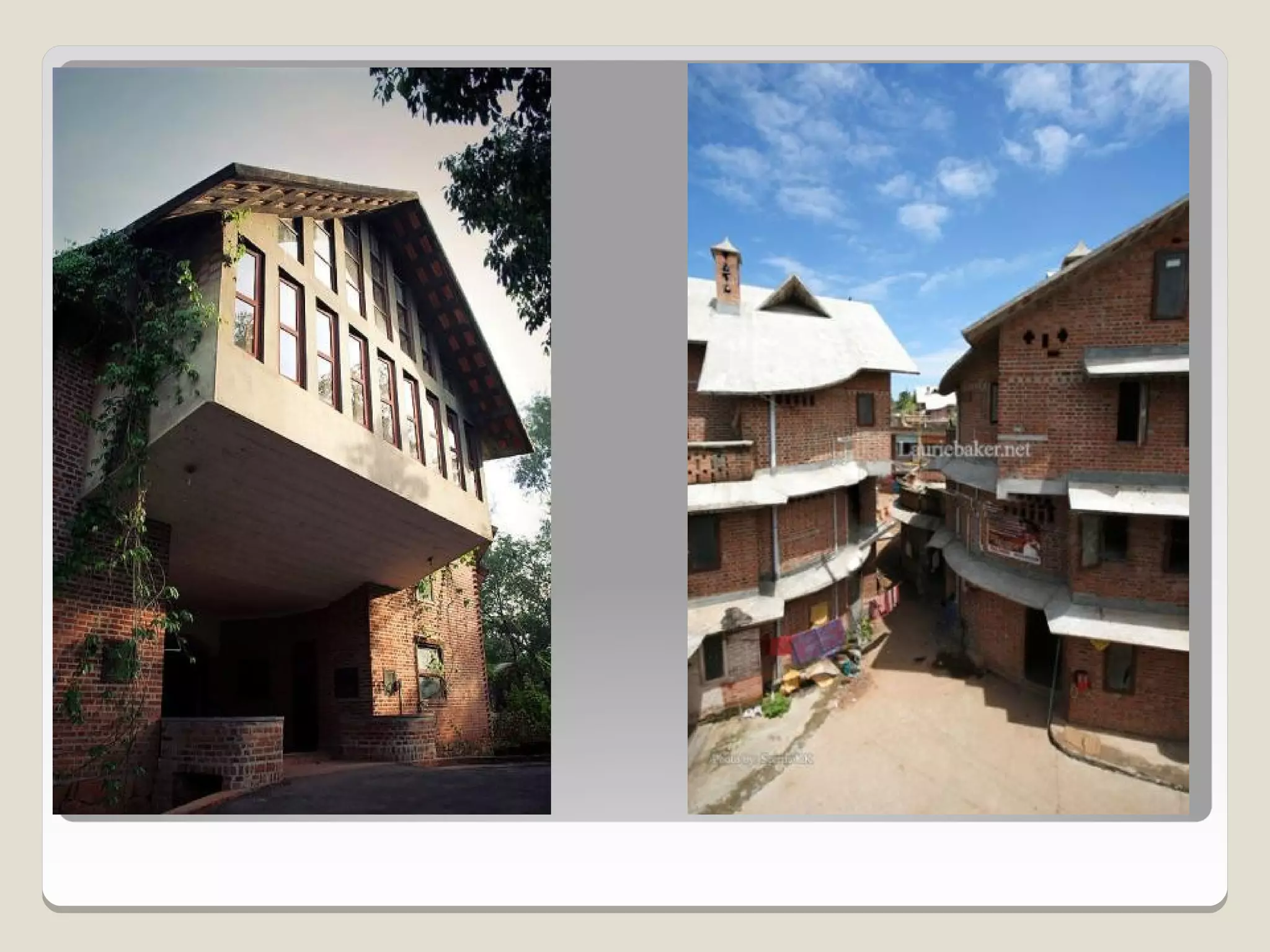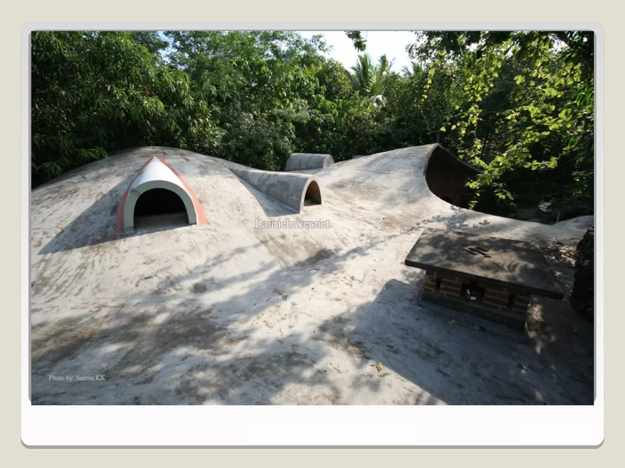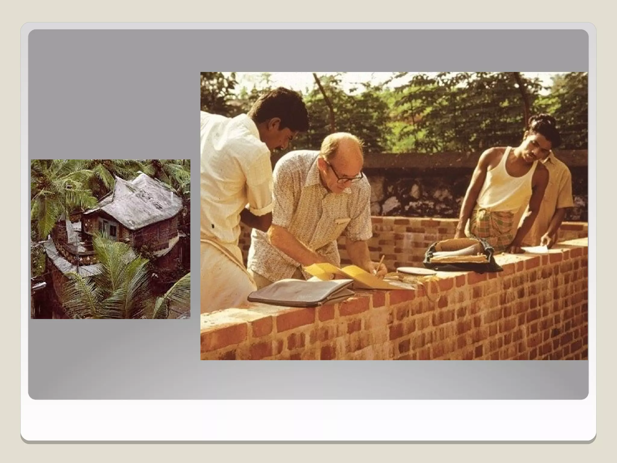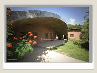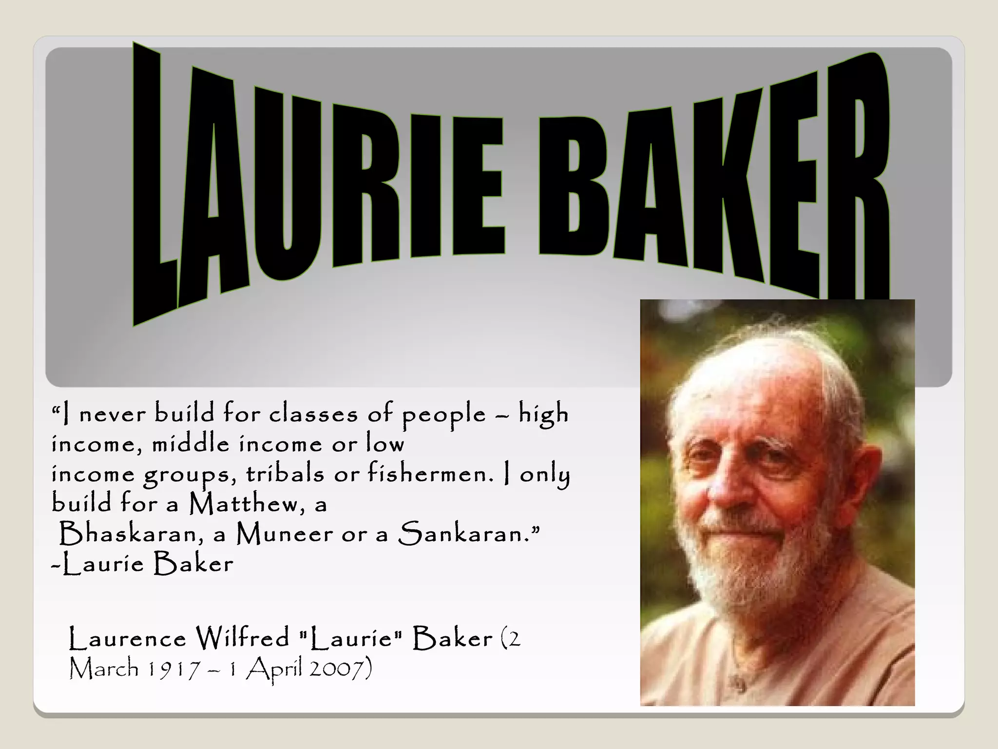 Laurie Baker, an influential architect, focused on building for individuals rather than income groups and utilized local materials and traditional methods in his designs. He emphasized cost-effective techniques that not only reduced material usage but also incorporated energy-efficient concepts like arches and domes. His notable projects include the Center for Development Studies and the Loyola Chapel, showcasing innovative designs that addressed both aesthetics and functionality while promoting community involvement in housing solutions.
