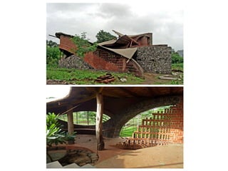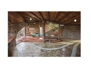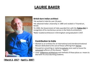 Laurie Baker was a British-born Indian architect who worked in India for over 50 years. He is known for his low-cost and sustainable architectural designs that used local materials and techniques. Some key aspects of his work included using indigenous construction methods, improvising designs based on each site, focusing on cost-effective designs suited to lower income groups, and promoting simplicity. A notable project was the Centre for Development Studies in Trivandrum, which used many of Baker's signature design elements like filler slabs, rat trap bond masonry, and brick screens.