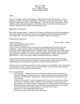 Laurie C. Hrupek is seeking a new opportunity where she can contribute as a strong team member and help a company thrive. She has over 15 years of experience in customer service, order fulfillment, and project management. Her skills include Excel, Access, and experience with QAD, SAP, SalesLogix, and other applications. She currently works as a Senior Order Fulfillment Administrator at Anritsu Company, where her accomplishments include process improvements and representing the company with key customers.