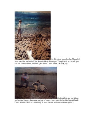 This photo collection contains pictures of the author with family members from trips to locations in Argentina. The photos depict the author's father, brothers, and sister from visits to Bariloche, San Antonio Oeste, Rio Negro, and Choele Choel - small cities and beaches in Rio Negro province. While the author has not been to Spain, a photo from Barcelona is included and they express a desire to travel there in the future.