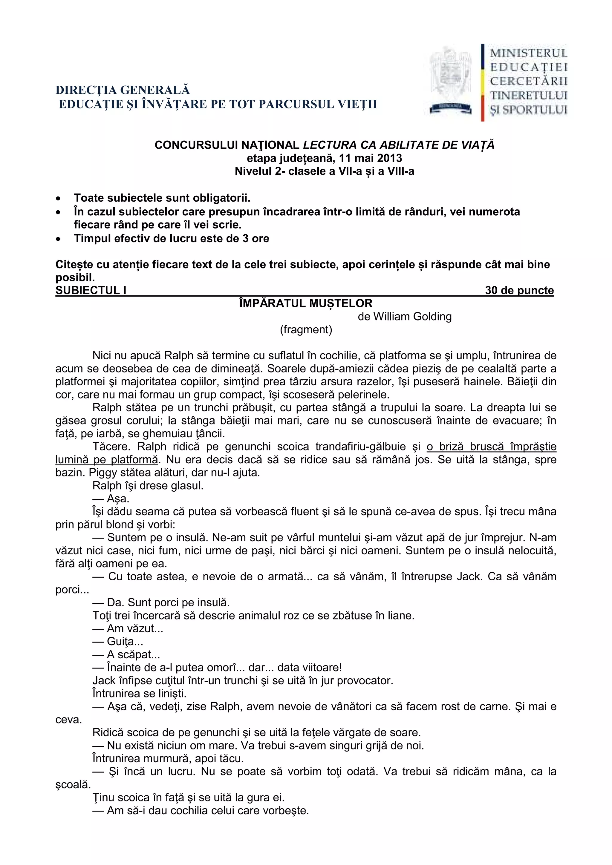 Documentul este despre etapa județeană a concursului național "Lectura ca abilitate de viață" dedicat elevilor din clasele a VII-a și a VIII-a, care include un fragment din romanul "Împăratul muștelor" de William Golding. În cadrul întâlnirii dintre băieți, ralph își exprimă ideea că se află pe o insulă nelocuită și că trebuie să se organizeze pentru a supraviețui, în timp ce un băiețel ridică îngrijorarea despre existența unei fiare. Dezbaterile asupra acestei fiare demonstrează fricile și neînțelegerile din grup, în ciuda optimismului manifestat de ralph cu privire la posibilitatea salvării lor.