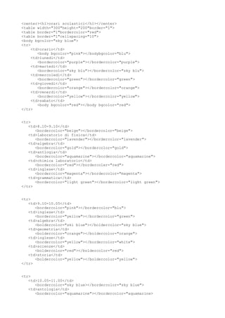The document contains a table that outlines the weekly class schedule for a school. The table lists the classes for each day of the week from Monday to Saturday, divided into time slots between 8:10-14:05. Each cell indicates the subject taught during that period and day. The schedule includes classes such as physics, algebra, English, history, computer science, and more.