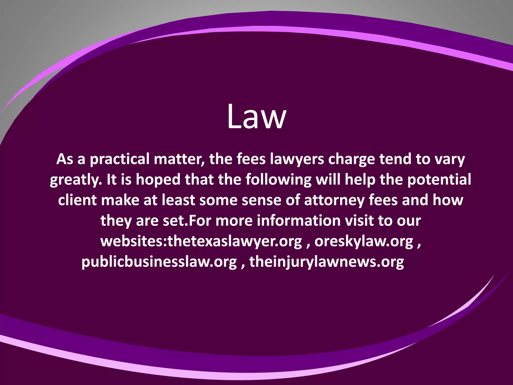 The document outlines the variability of lawyer fees and emphasizes the importance of understanding attorney qualifications, such as board certifications and ratings from Martindale-Hubbell and Super Lawyers. It highlights the necessity of legal knowledge to protect oneself and the complexity of laws in different disciplines, as well as discussing state business licensing requirements. Additionally, it addresses California personal injury law, which aids individuals injured due to the negligence of others and the potential for product recalls.