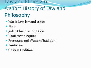 This document provides a short history of law and philosophy. It discusses ancient Greek philosophers like Plato, the Judeo-Christian tradition, Thomas Aquinas, the Protestant tradition, positivism, and the Chinese tradition. It also examines definitions of law and the relationship between law, ethics, and morality.