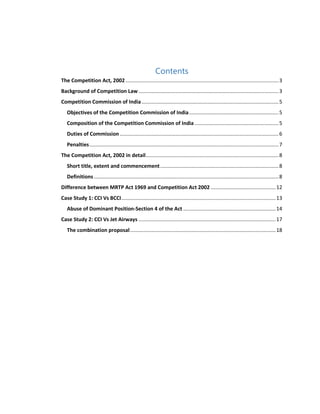 The document summarizes India's competition laws and the role of the Competition Commission of India (CCI) in enforcing these laws. It provides background on the development of competition policy in India and discusses key aspects of the Competition Act of 2002 such as objectives of the CCI, its composition, duties, and penalties for non-compliance. The summary also highlights two case studies where the CCI investigated alleged anti-competitive practices by BCCI and Jet Airways.