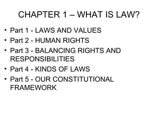 This document provides an overview of the concept of law. It discusses how laws reflect societal values and human rights. It also describes the different types of laws, including criminal vs. civil laws, and the levels of required proof in each. Additionally, it examines the balance between rights and responsibilities and how the US Constitution works to limit government powers through the principles of separation of powers and judicial review.