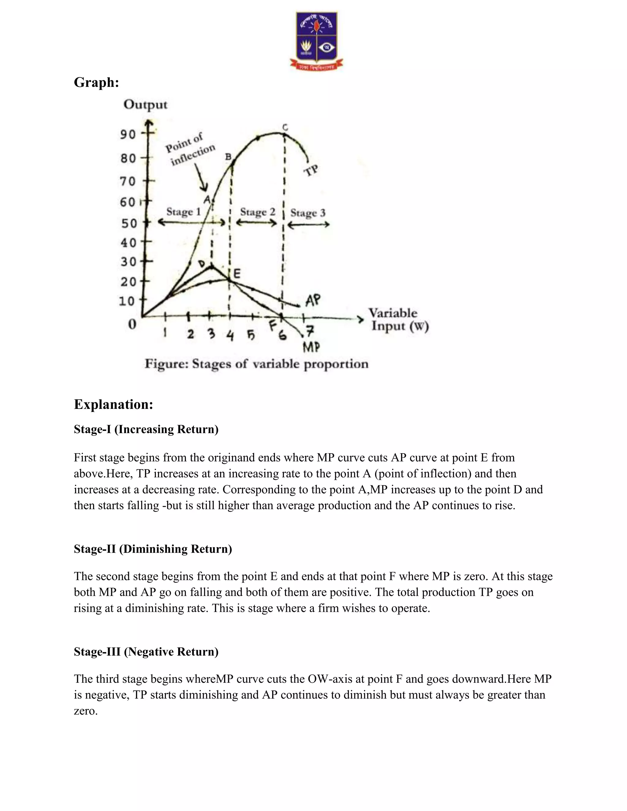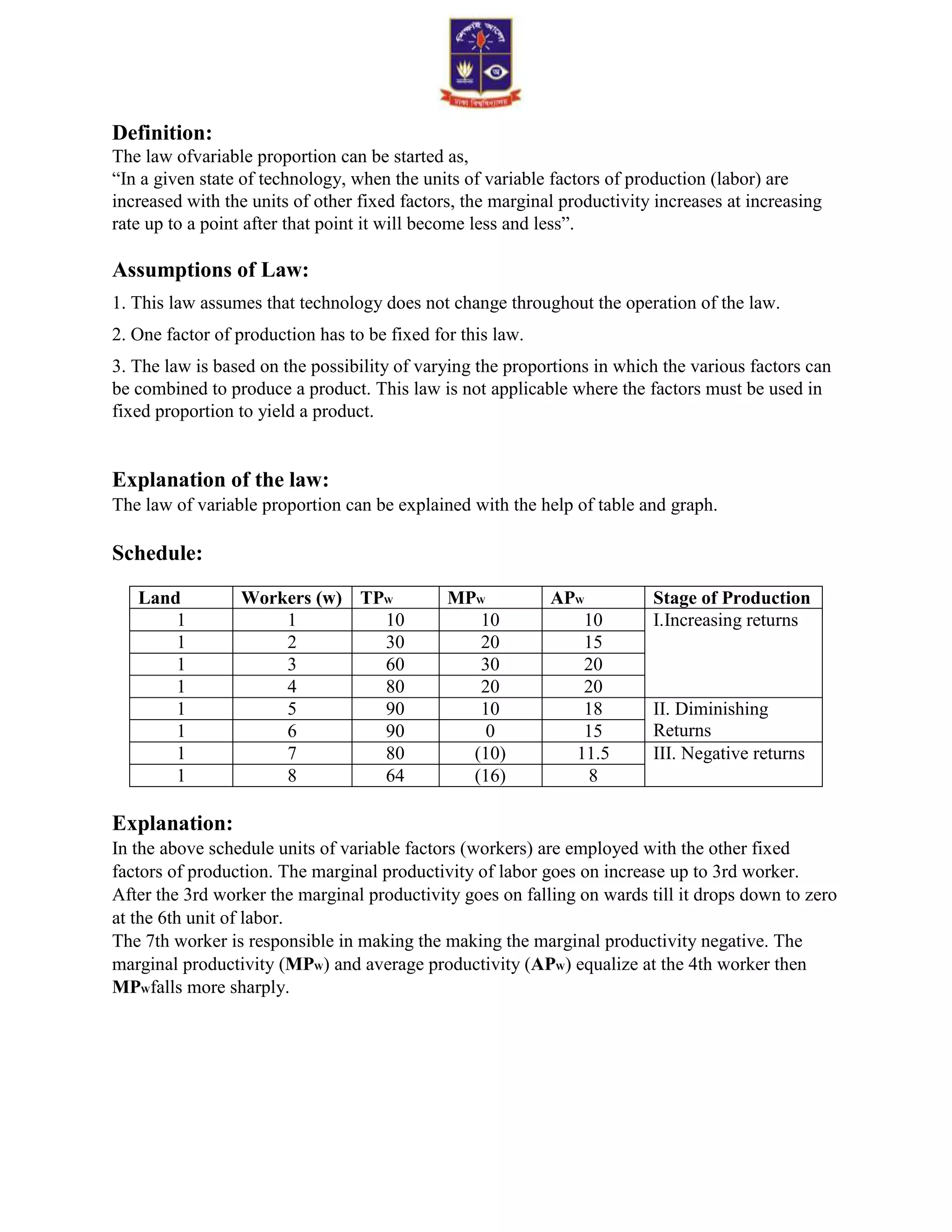 The law of variable proportions states that when one variable input is increased while other inputs are held fixed, marginal productivity initially increases but eventually decreases. It assumes technology remains constant and one input can vary while others are fixed. Marginal productivity rises until the third worker is added, then falls, reaching zero at the sixth worker and becoming negative at the seventh worker. The law has three stages: increasing returns as marginal exceeds average productivity, diminishing returns as both fall but remain positive, and negative returns as marginal productivity declines below zero.