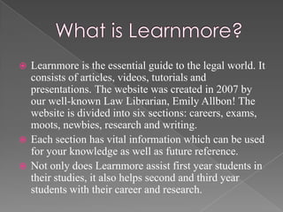 Learnmore is a website created in 2007 to provide legal resources to students. It contains articles, videos and presentations across six sections: careers, exams, moots, newbies, research and writing. Each section provides vital information for students in their studies and future careers. The website offers clear and easy to understand guidance on topics like exams, mooting, note taking and more. It is a beneficial resource for law students from first to third year.