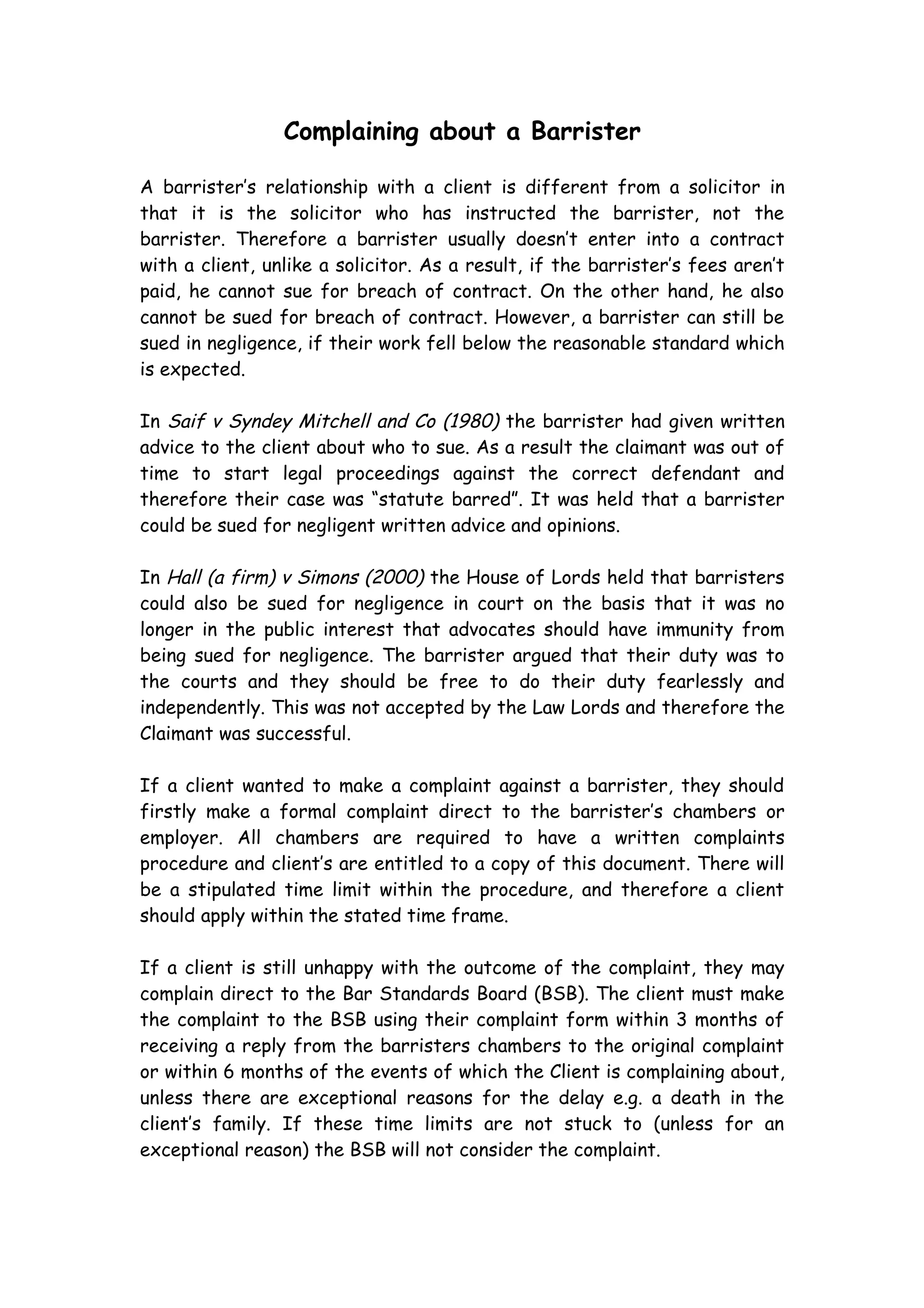 A client who wishes to make a complaint about a barrister has several options. They can first complain directly to the barrister's chambers, and if unsatisfied with the response, complain to the Bar Standards Board (BSB). If still unsatisfied after a BSB investigation and hearing, the client can then take their complaint to the Legal Services Ombudsman (LSO). Beginning in 2010, a new organization called the Office for Legal Complaints will handle all legal complaints instead of individual regulatory bodies like the BSB.