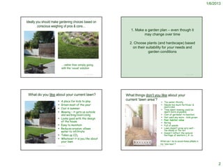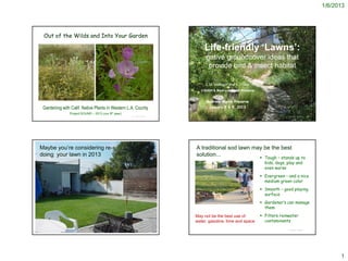This document discusses alternatives to traditional grass lawns that are more sustainable and provide habitat. It suggests that homeowners thoughtfully consider their needs and property conditions when planning garden spaces. Native plants that offer benefits like food and habitat are recommended over water-intensive non-native grasses. Specific native plant ideas mentioned include currants, elderberry, and species suitable for partial shade on clay soil. The goal is for gardens to work with a property's natural heritage rather than against it.